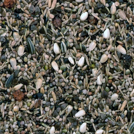 Alpiste, sarrazin, chanvre, graines sauvages, graine de radi, cardi, navette, perrilla brun, perilla blanc, niger, graminée, avoine pelée, tournesol strié, sorbier, églantier, graine de lin.